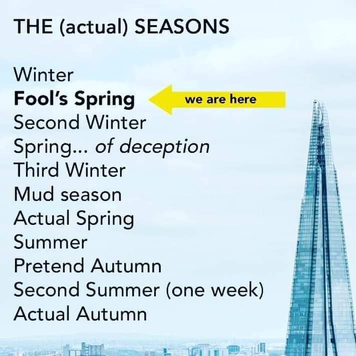 Distinct feel of spring in the air this week. Which is weird, because it’s February. But never forget this handy guide to the seasons: