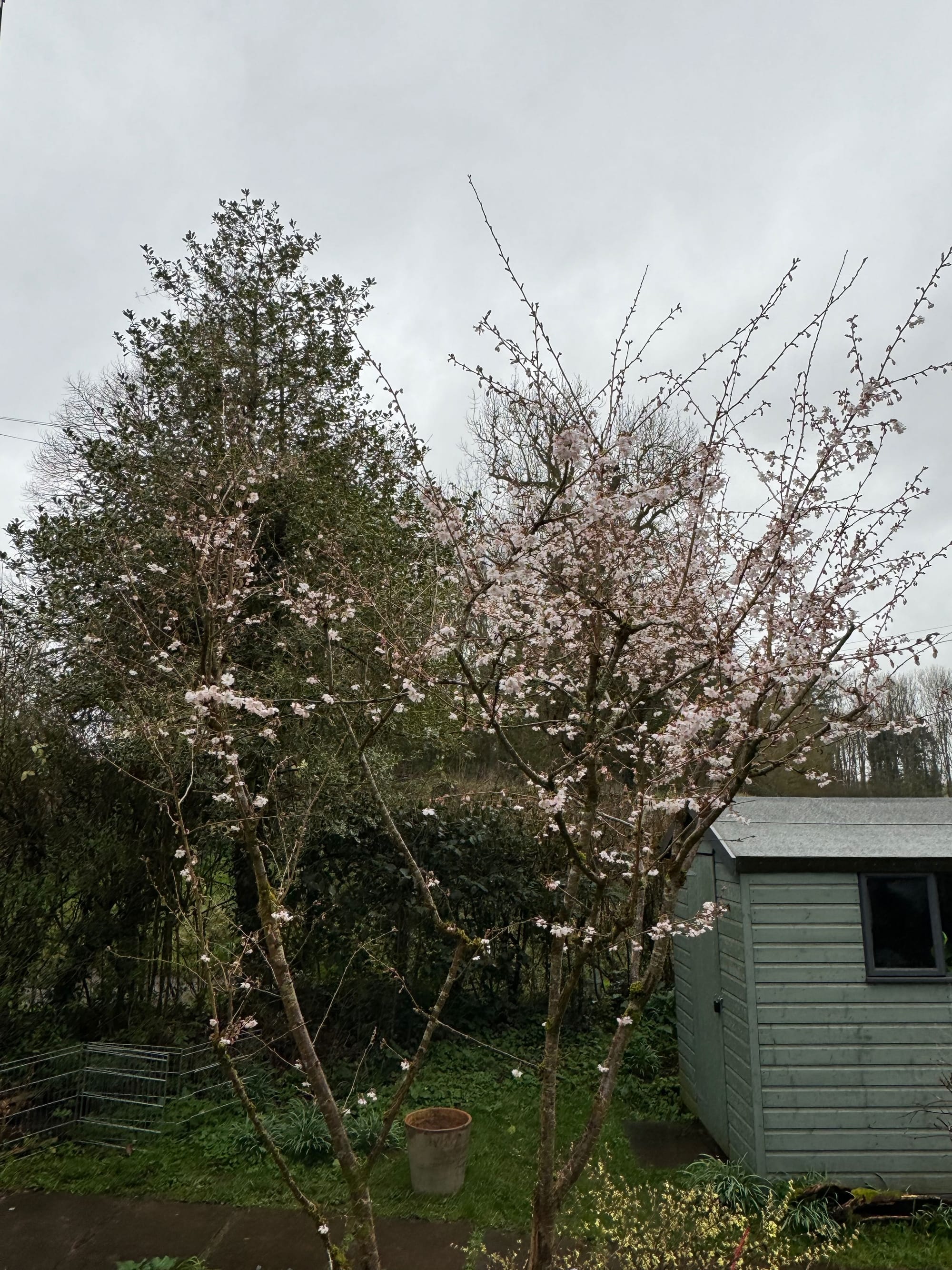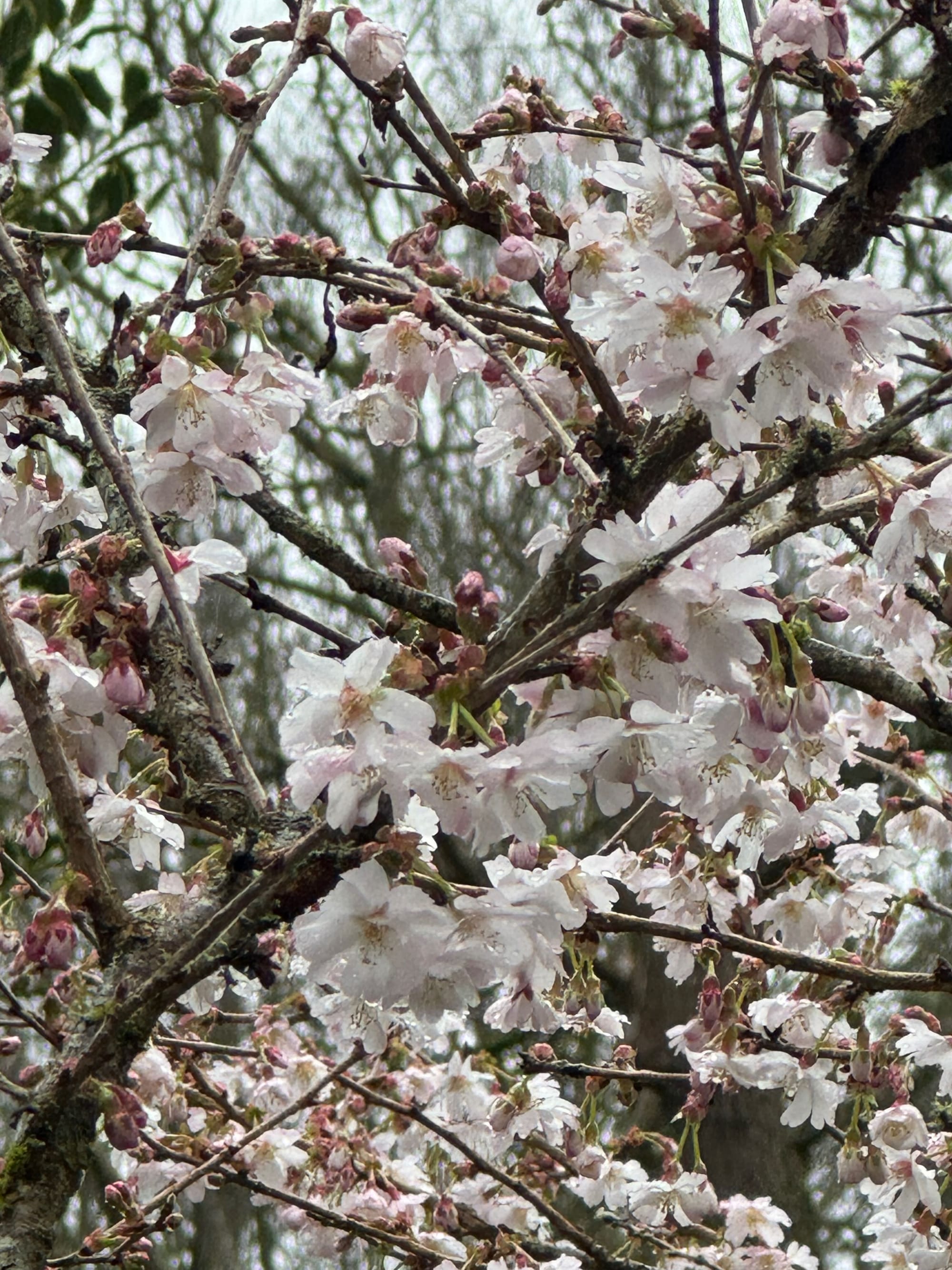 The ornamental flowering tree at the back of the house. I’m not sure if it’s a cherry or a plum. I’ve been assuming cherry...